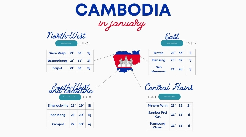 The most attractive feature of the northwestern Cambodian provinces in January is the temperature in Siem Reap, Battambang, and Poipet, which ranges from 21-32 degrees Celsius and receives very little rainfall as well. This is the best time to visit the Angkor Wat Archaeological Park, which contains ancient temples.