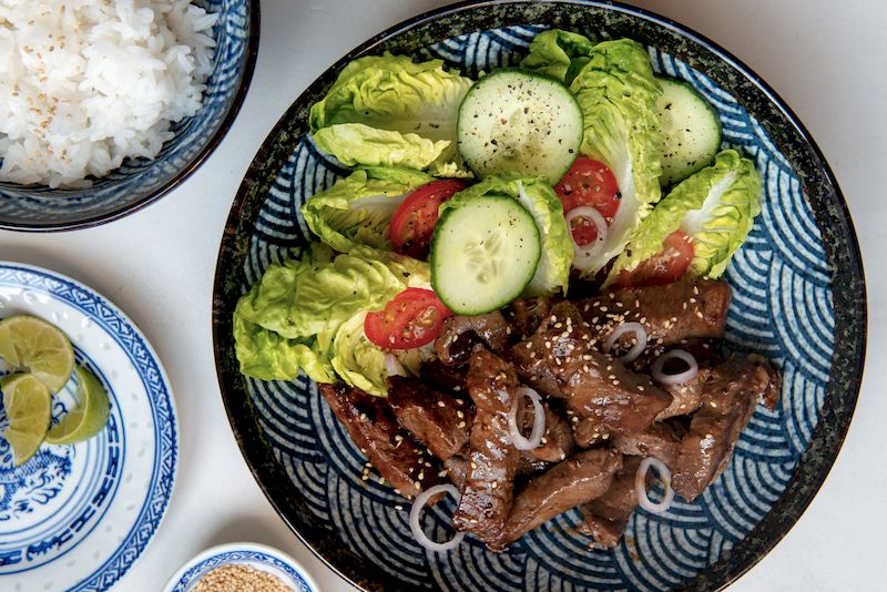 Bai sach chrouk is a classic Cambodian breakfast made with grilled marinated pork served over white rice. It's usually accompanied by fresh cucumbers, herbs, and pickled vegetables.