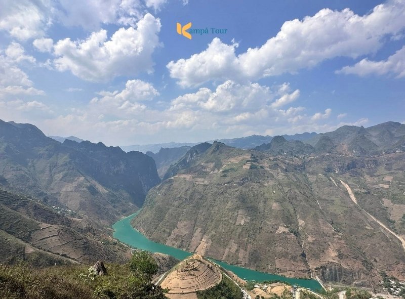 On the Ma Pi Leng Pass, pause to visit the Nho Que River and Tu San Canyon, a natural masterpiece on the Ha Giang Loop. The emerald green river winds through towering cliffs, offering stunning yet serene views.