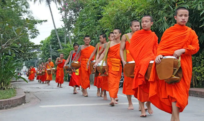Rise early to witness the sacred daily alms-giving tradition, where over 200 Buddhist monks collect food offerings from locals in the streets.