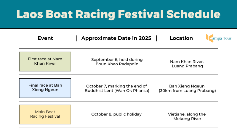 The first major race is typically held in Luang Prabang around the midpoint of Buddhist Lent, followed by several others along the Mekong River and other waterways. The final race takes place in Vientiane. The first and last races are by far the largest and most important.