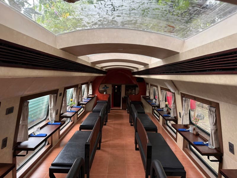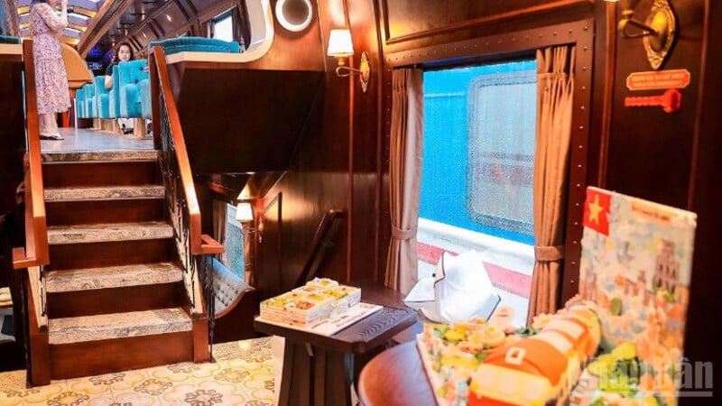 The train consists of five double-decker carriages, each offering 40 to 60 seats, along with two carriages specially designed for photos and “check-in” moments. The interior, elegant and themed differently in each carriage, immerses passengers in an atmosphere that is both stylish and nostalgic. Large windows allow for unobstructed views of the cityscape and surrounding countryside.