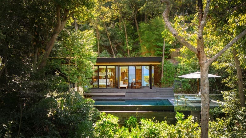 Six Senses Krabey Island, a luxury hotel in Cambodia just a 15-minute boat ride from Sihanoukville. Nestled on a private island in the Gulf of Thailand, this eco-conscious resort blends modern villas with natural materials like basalt and koki wood. Each villa boasts a private pool, rainforest or sea views, and a spacious sunken bathtub.