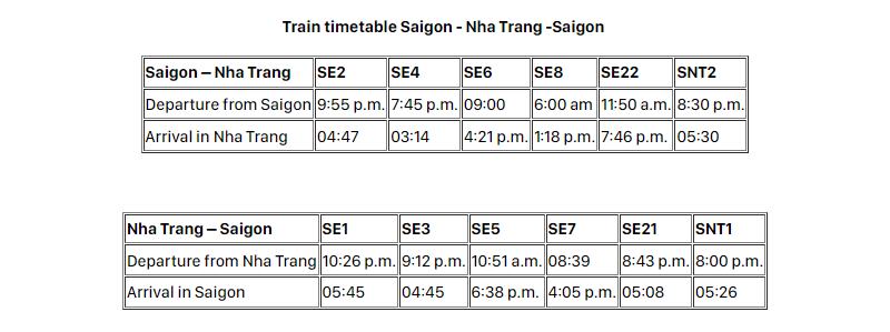 (The information is for reference only. For exact timetable, please check the official website (dsvn.vn) of Vietnam Railways).