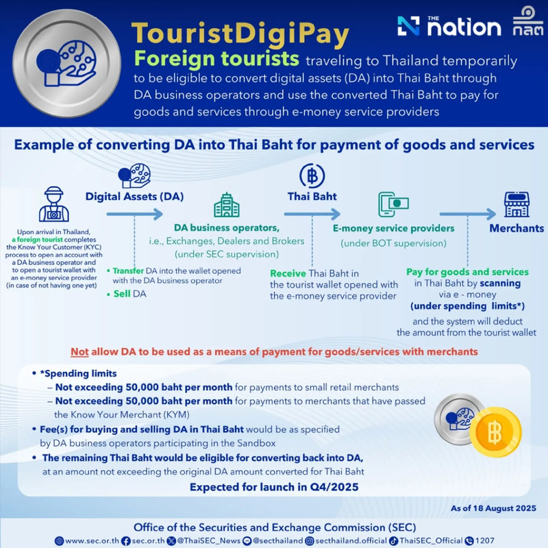 Foreign tourists who wish to convert their digital assets into Thai baht for spending must first open an account with a digital asset service provider and an e-money provider.