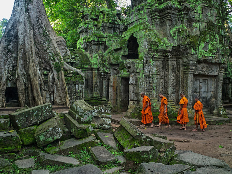 Explore Banteay Srei temple (Citadel of Women), the highly sacred temples of Takeo, Banteay Kdei, and the impressive temple of Ta Prohm—an abandoned Buddhist monastery overgrown with trees and its gigantic snake-like roots (Ta Prohm, famous from the 'Tomb Raider' movie, with jungle-covered ruins).