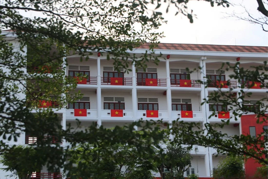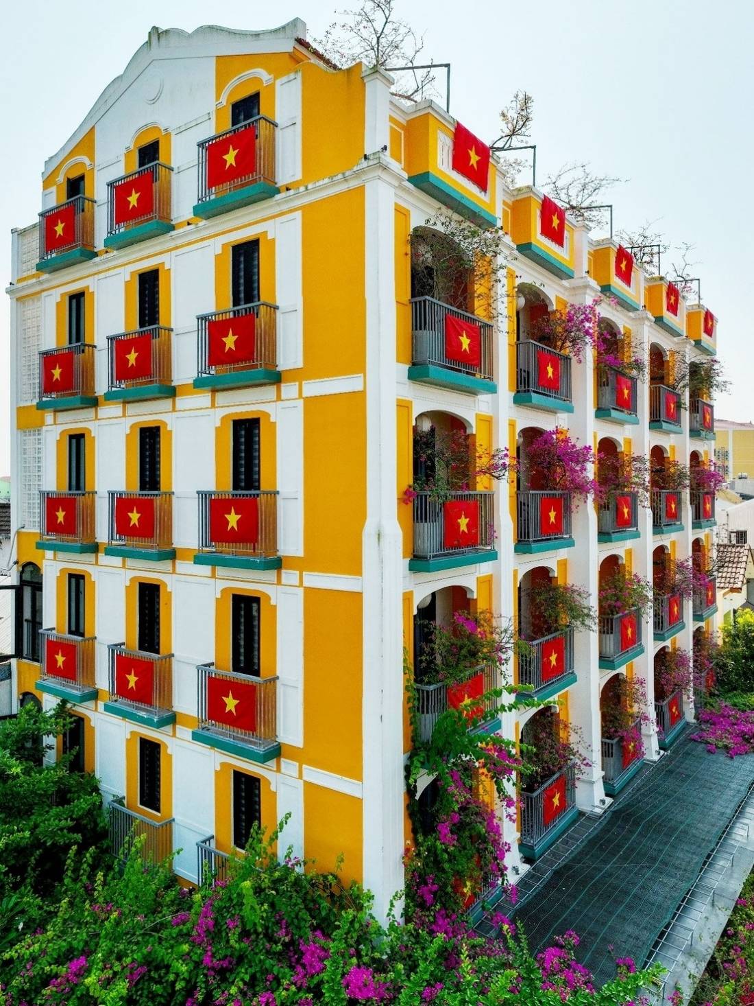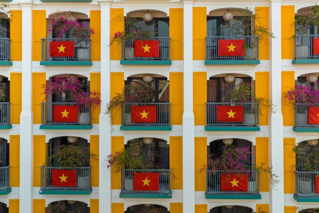 In Hoi An, a landmark hotel stands out with its 80 Vietnamese flags hanging from its balconies, creating a striking scene.