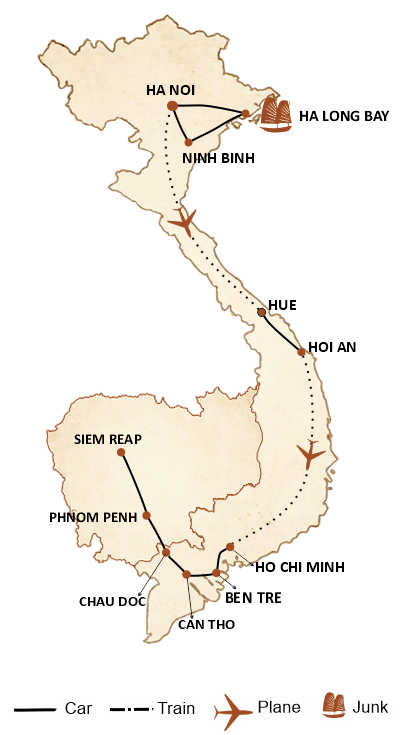 This 15-day Vietnam and Cambodia combo tour is a complete experience, blending culture, nature, and history, for an unforgettable journey through these two beautiful countries. For more information, see Vietnam and Cambodia 2 weeks.